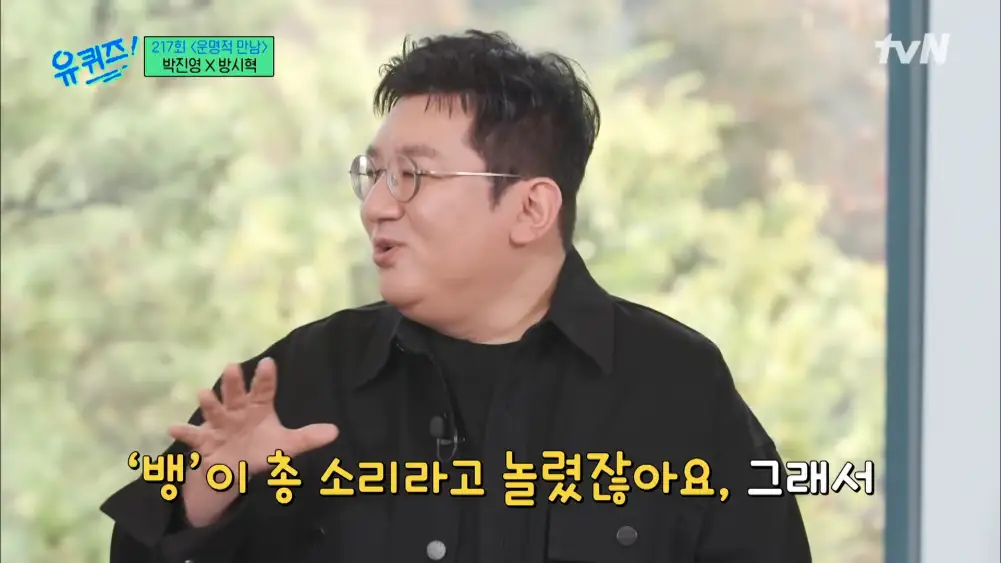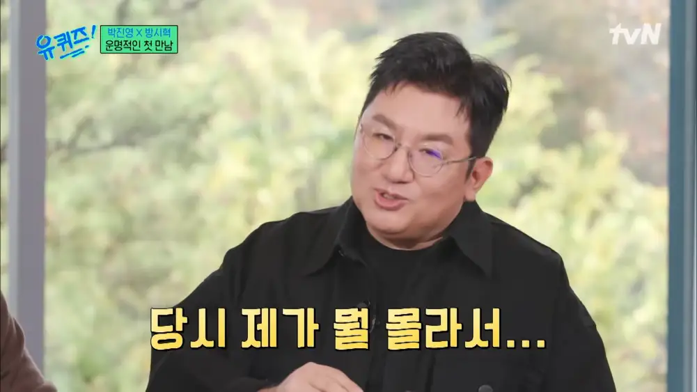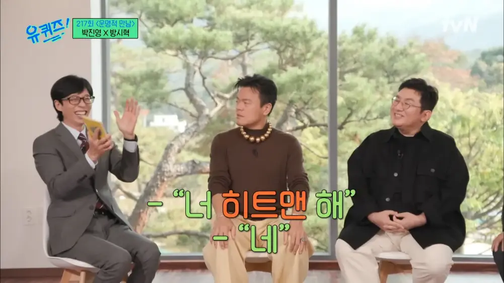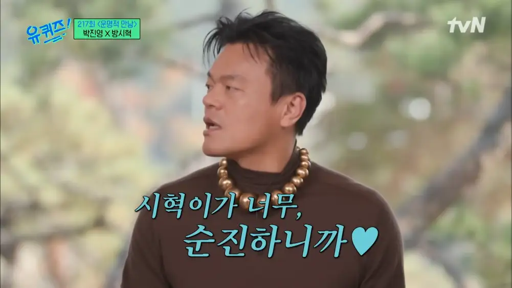 J.Y.朴随后分享了他的故事。他解释说,'当我见到他时,他没有任何面部表情。”方时赫为自己辩护,“这是因为我很害羞。J.Y.帕克继续说道,“是的,那是他害羞了 ,但我喜欢这样的人。我害怕那些说“你好!”的人。 (他们过于友好)。但如果人们像他(方时赫饰)一样说:“你要为我做什么?”我不害怕。他很可爱。那时的时赫和现在的时赫是一样的。那时,当我向人们介绍时赫时,每个人都会走过来问我,“他怎么了?”我解释说,“这是因为他害羞。”
