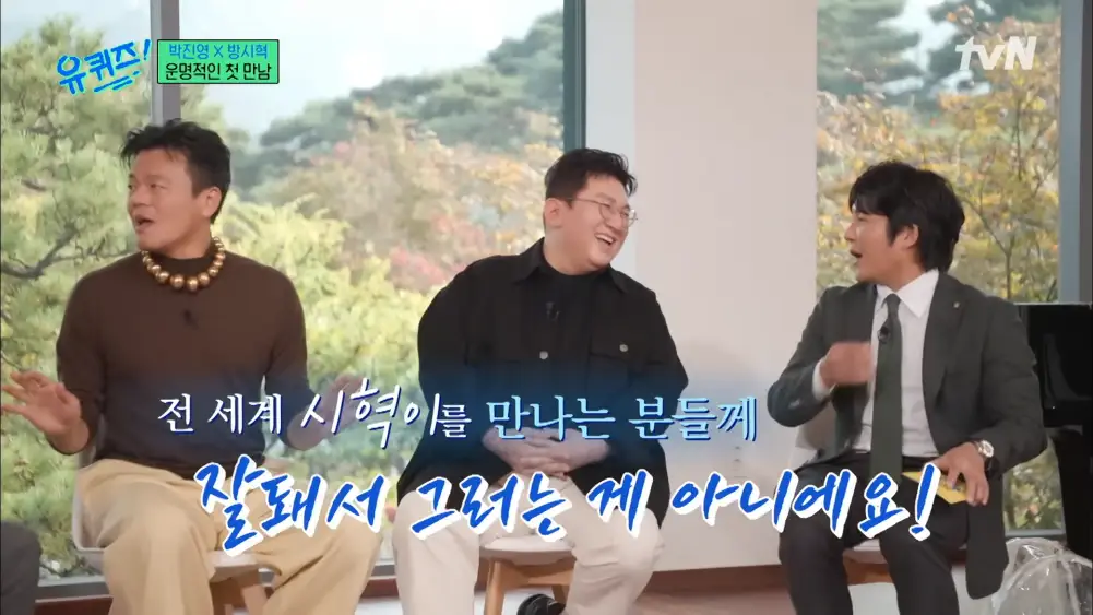 J.Y.朴随后为方时赫辩护说:“我想告诉世界上所有人的是,他不是因为他做大了才变成这样的。他一直都是这样,”让大家都笑了。