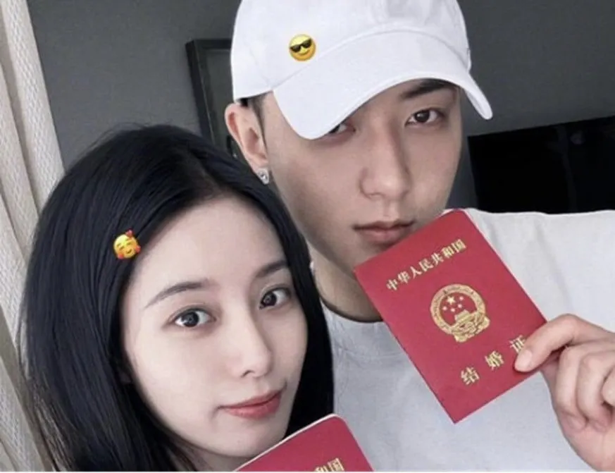 照片中有一个陶,其中包含中文婚礼证书,称为名称 Budjang, 给女演员 是的 ,那是在公共场所。在中国,该证书被签发以注册结婚。